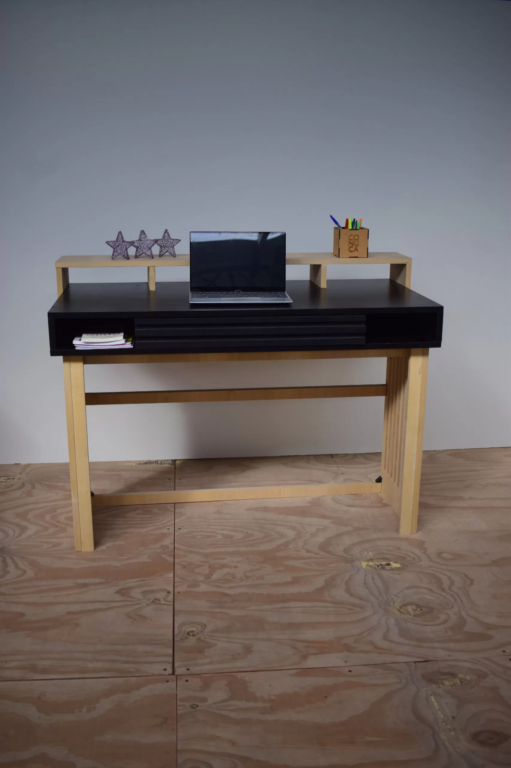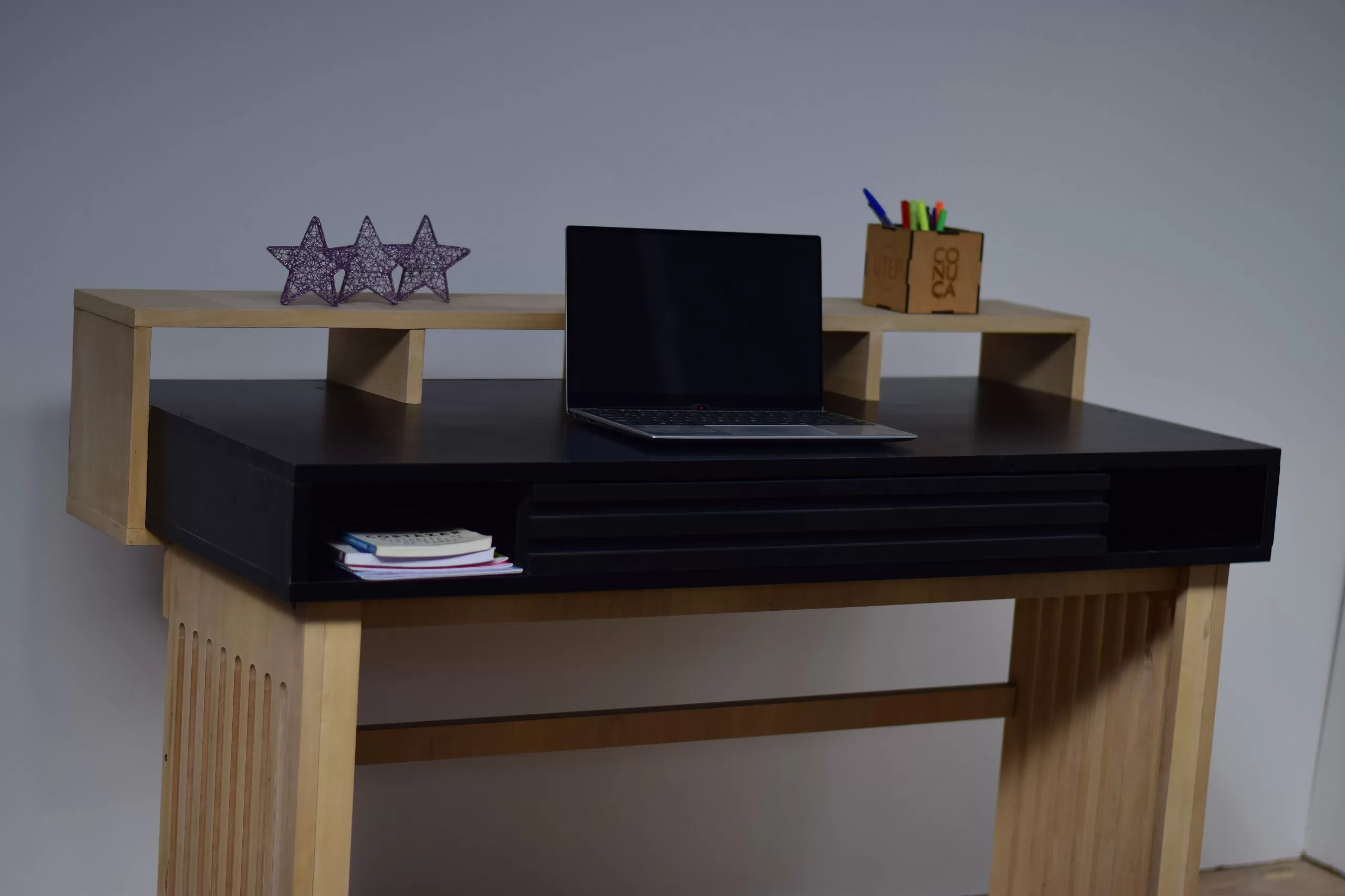 Su superficie de doble altura no solo te servirá de apoyo, sino que te permitirá tener los recursos al alcance de la mano. Tiene un diseño único y moderno gracias a sus laterales calados y detalle alistonado en el frente del cajón. El mismo te servirá para almacenar y organizar tus cosas, manteniendo el lugar de trabajo ordenado. Gracias a su composición de melamina es muy resistente a las manchas,podrás limpiarlo y mantenerlo fácilmente.