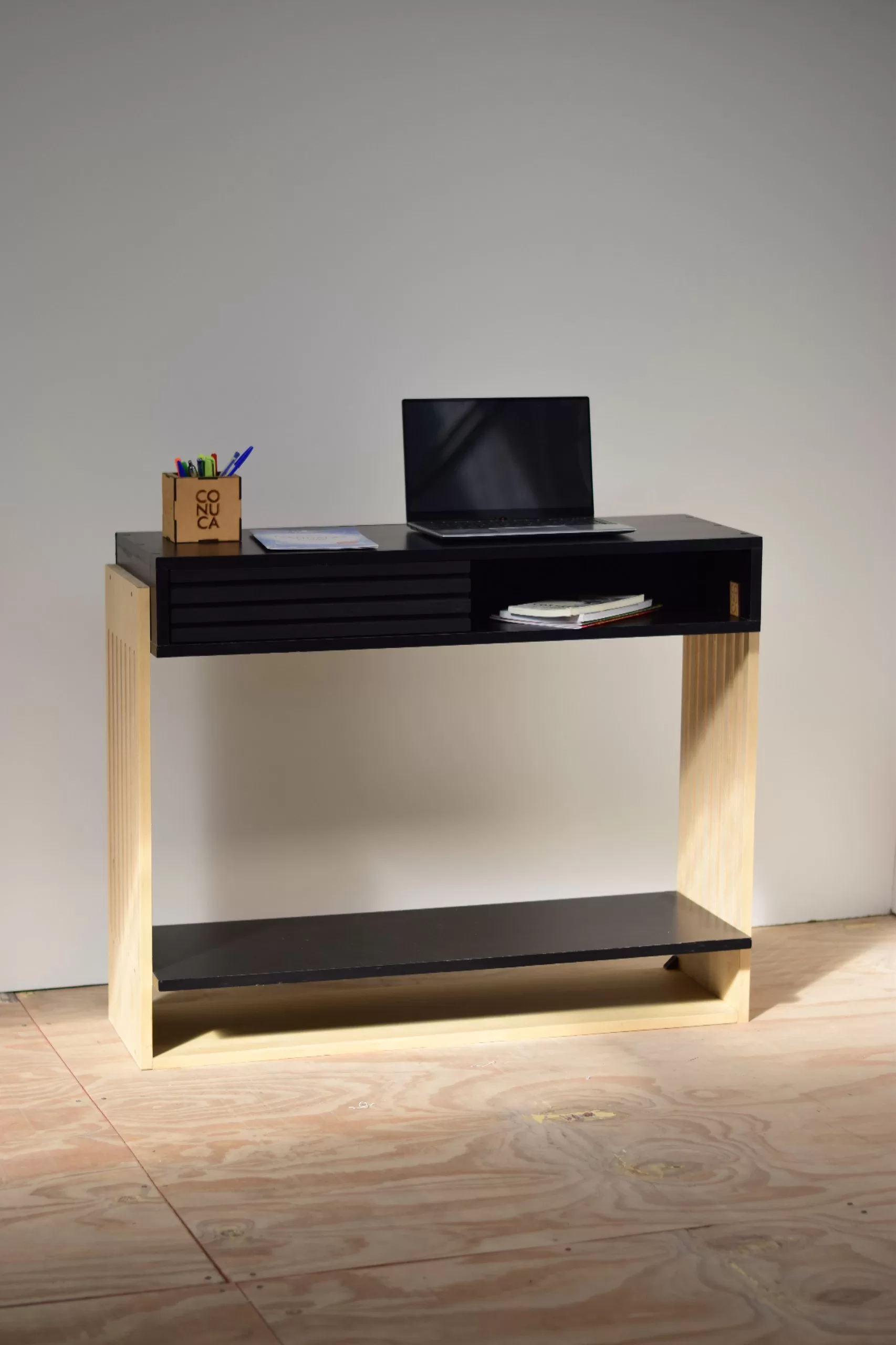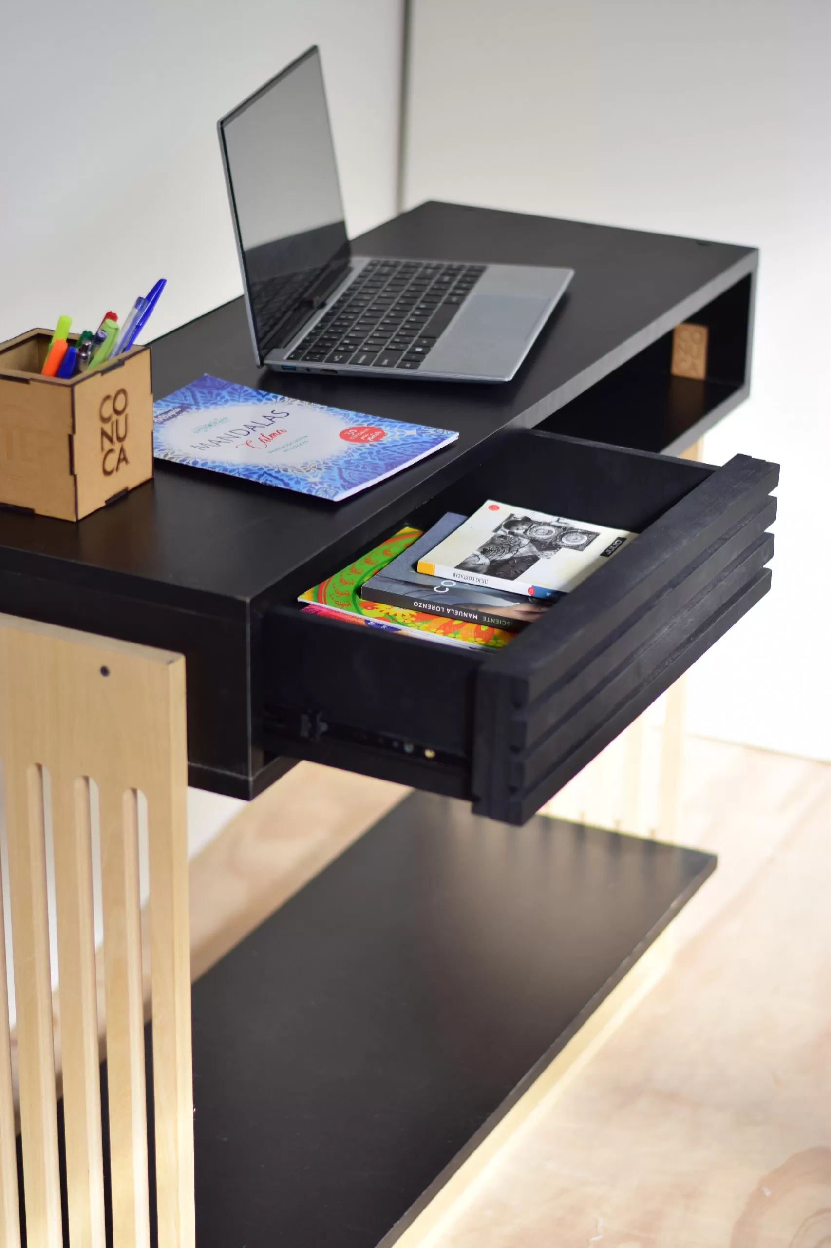 Material: MDF 18 mm enchapado en melamina color negro y guatambu natural. Tapa canto en su frente y laterales. 1 cajón con correderas telescópicas metálicas de MDF de 12 mm pintado con hidrolaca negra.