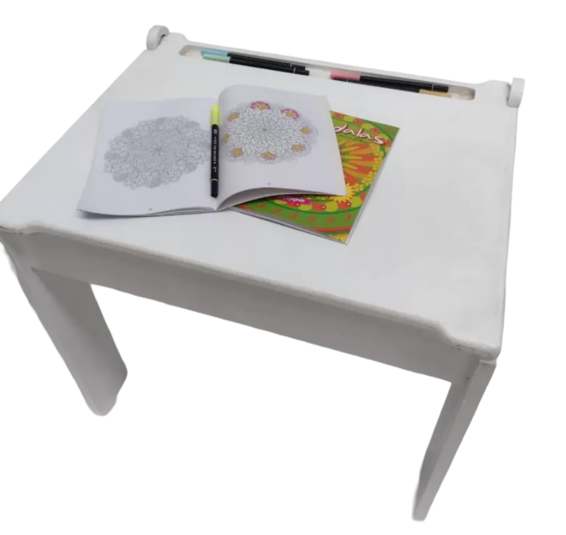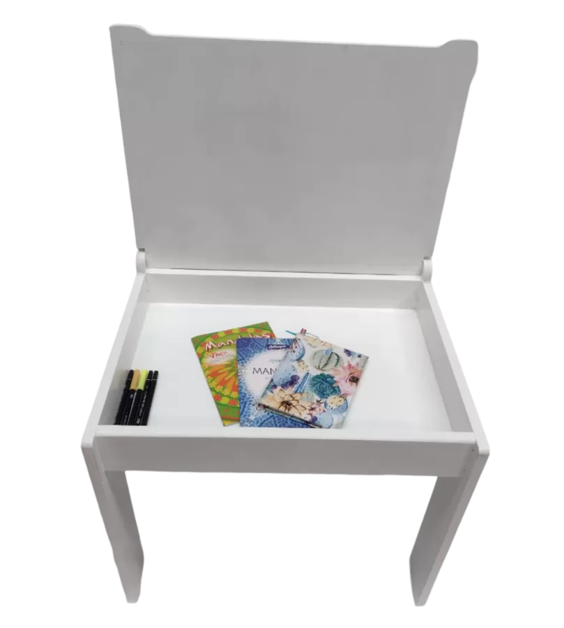 Mesa Infantil con tapa para guardado de útiles, libros o juguetes. Este mini escritorio posee una tapa práctica y fácil de levantar, para que tus niños guarden todo lo que quieran. Ideal para hacer las primeras tareas escolares. Al no ser muy grande puede ubicarse en cualquier parte de la casa. Estructura realizada en MDF pintado con hidroesmalte satinado color blanco. Acabado con hidrolaca transparente obteniendo mayor durabilidad. Se puede elegir diferentes tonos de colores.